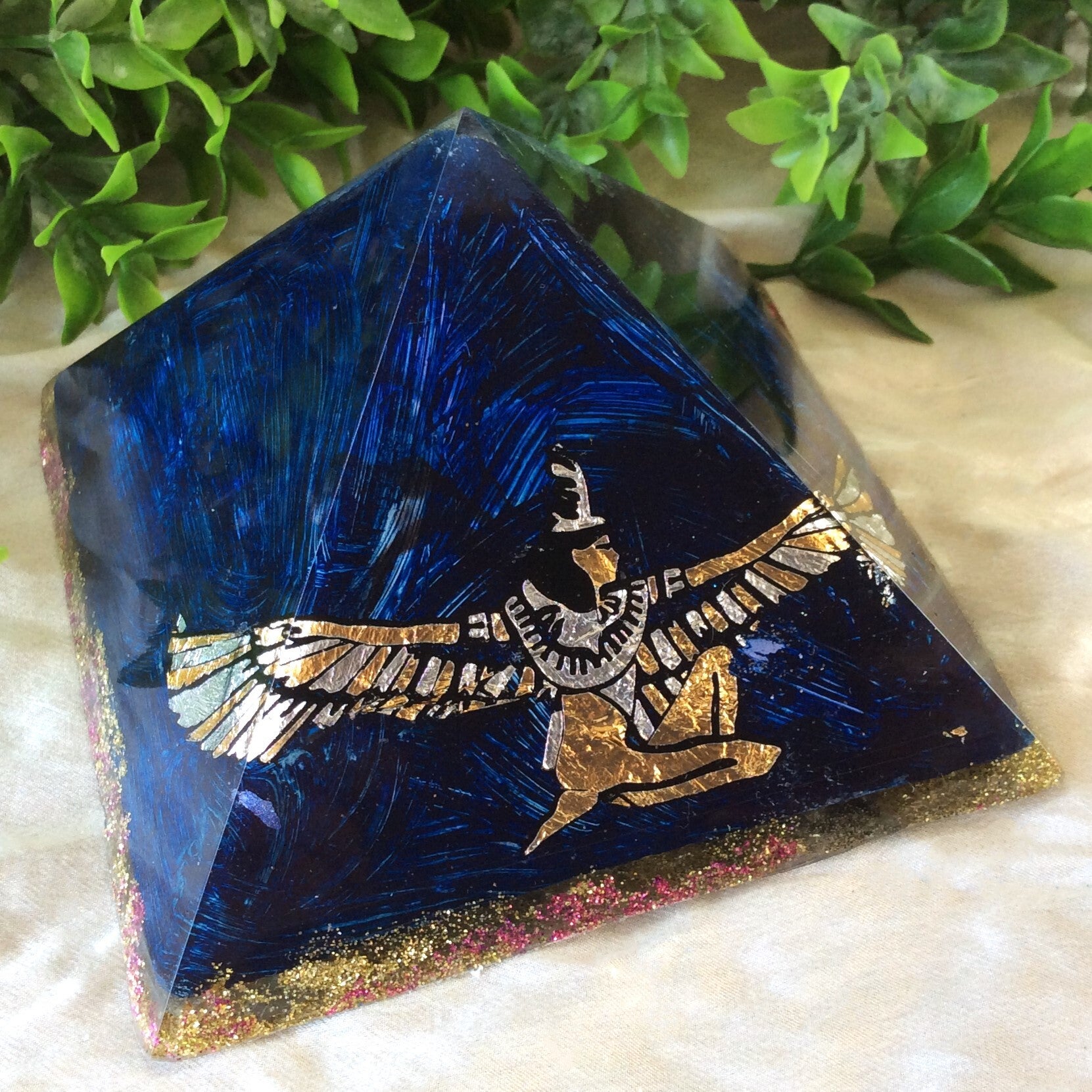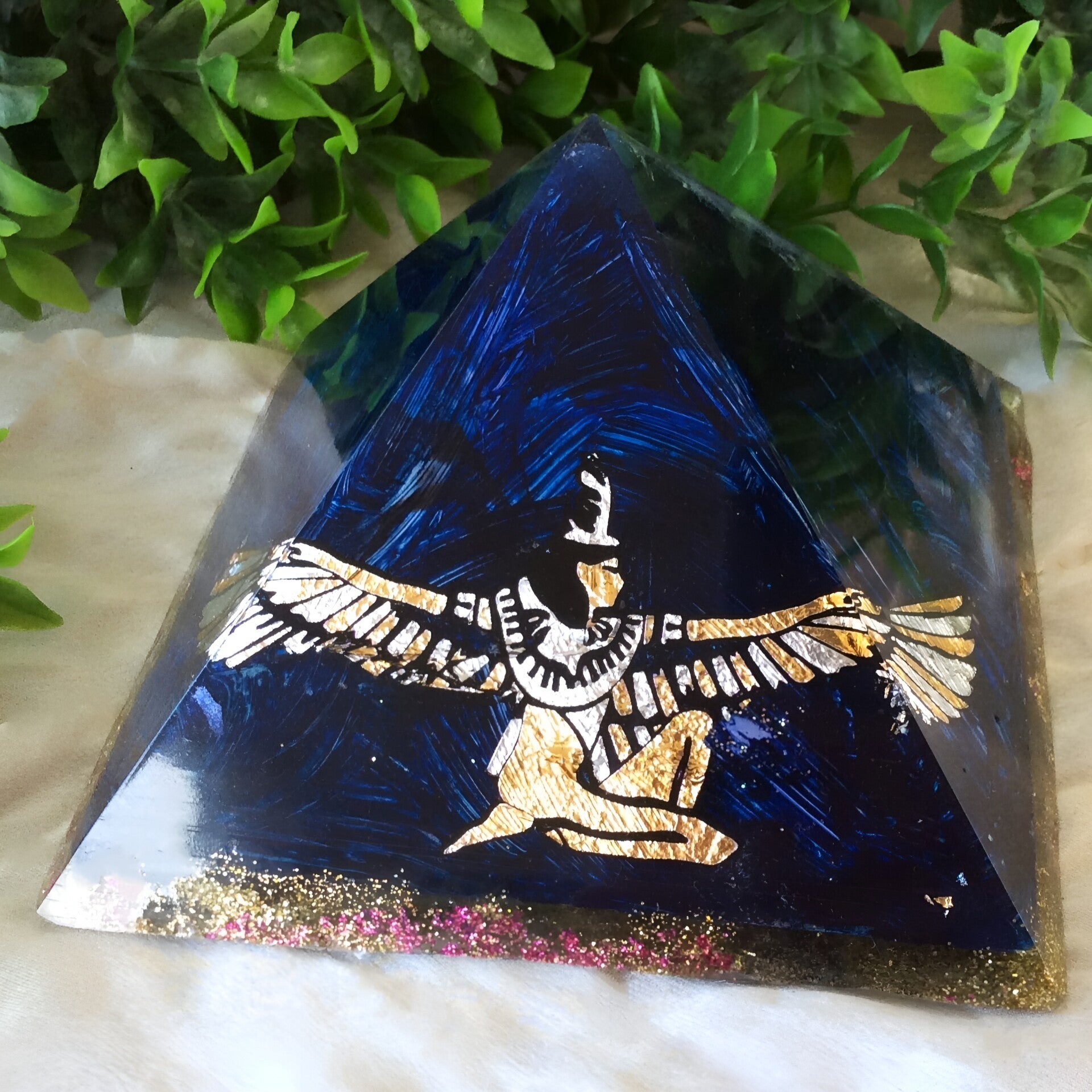 Deze piramide is opgeladen met energieen van Godin Isis. Als godin van de vruchtbaarheid belichaamt Isis de levenskracht en het moederschap. Isis is een beschermende godin, die bekend staat om haar zorgzame en helende eigenschappen. Mensen zoeken haar hulp in tijden van nood, vooral voor genezing en bescherming. Haar vleugels vertegenwoordigen de vrijheid van de ziel en haar vermogen om door de verschillende rijken van het bestaan te reizen.