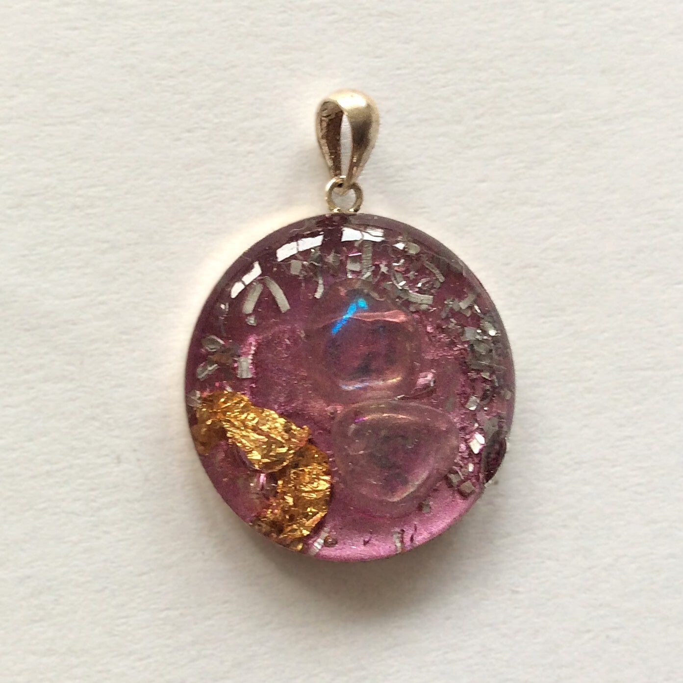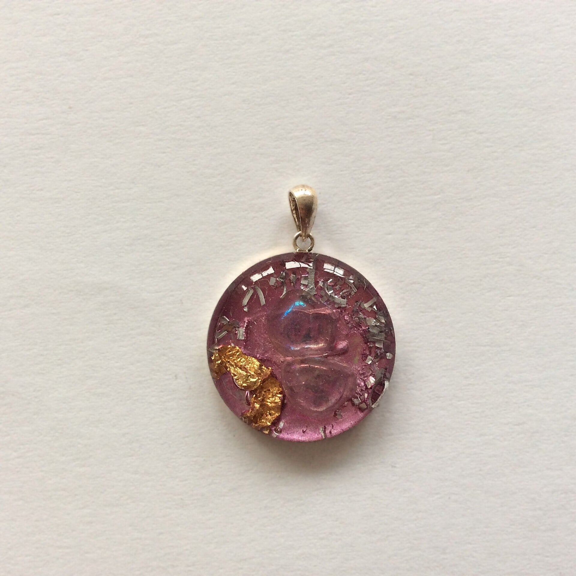 Met een zilveren achterkant en zilveren oogje en met bladgoud en metalen.