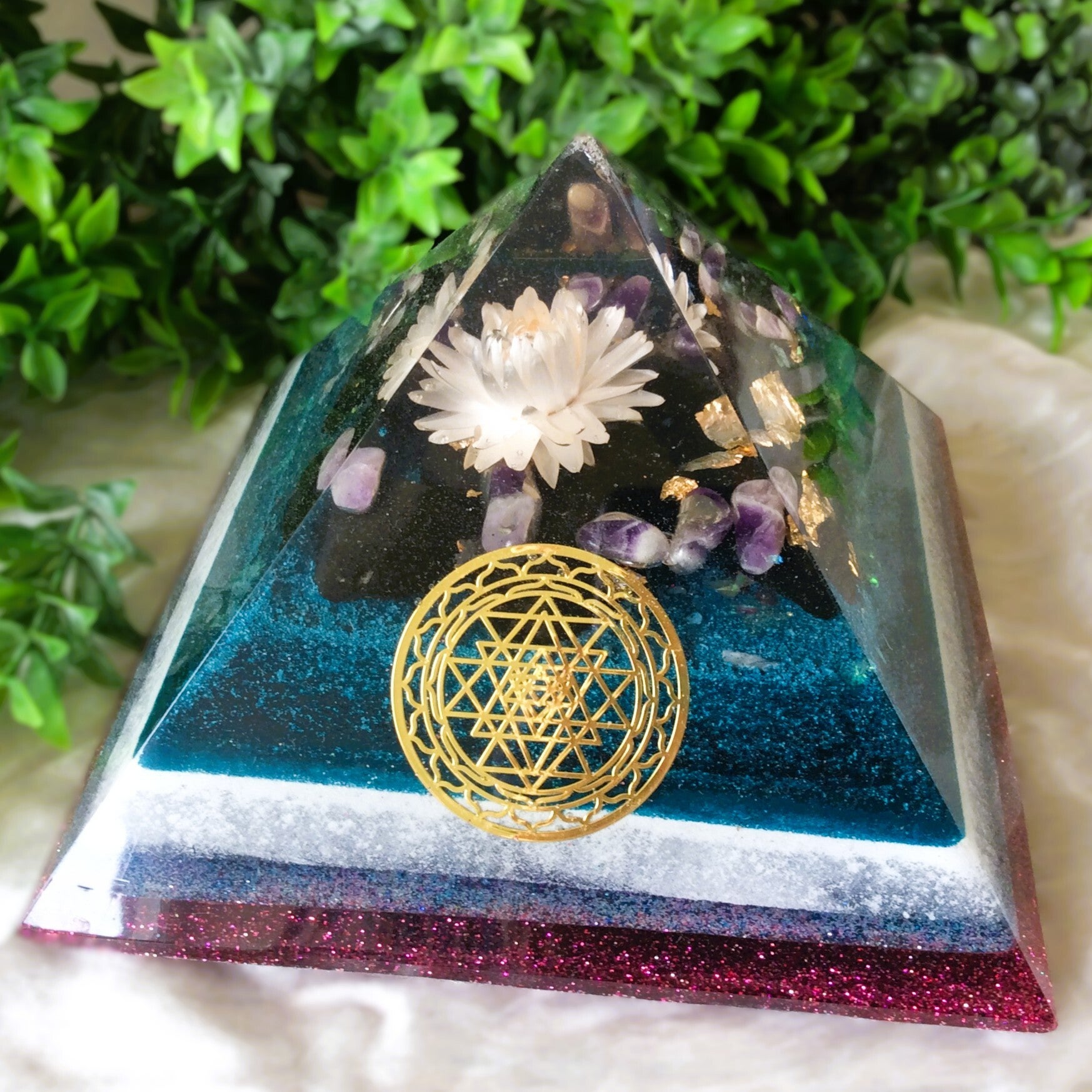 Deze orgonite piramide is in de verhoudingen van de grote piramide van Giza. Het heeft de meest perfecte verhoudingen om de orgonite energie goed te laten doorstromen. De vorm zorgt dat deze orgonite piramide een soort antenne wordt die kosmische energie aantrekt, ontvangt, bundelt en weer uitstraalt. De mooie energie harmoniseert en zorgt voor een verhoogde trillingsfrequentie.