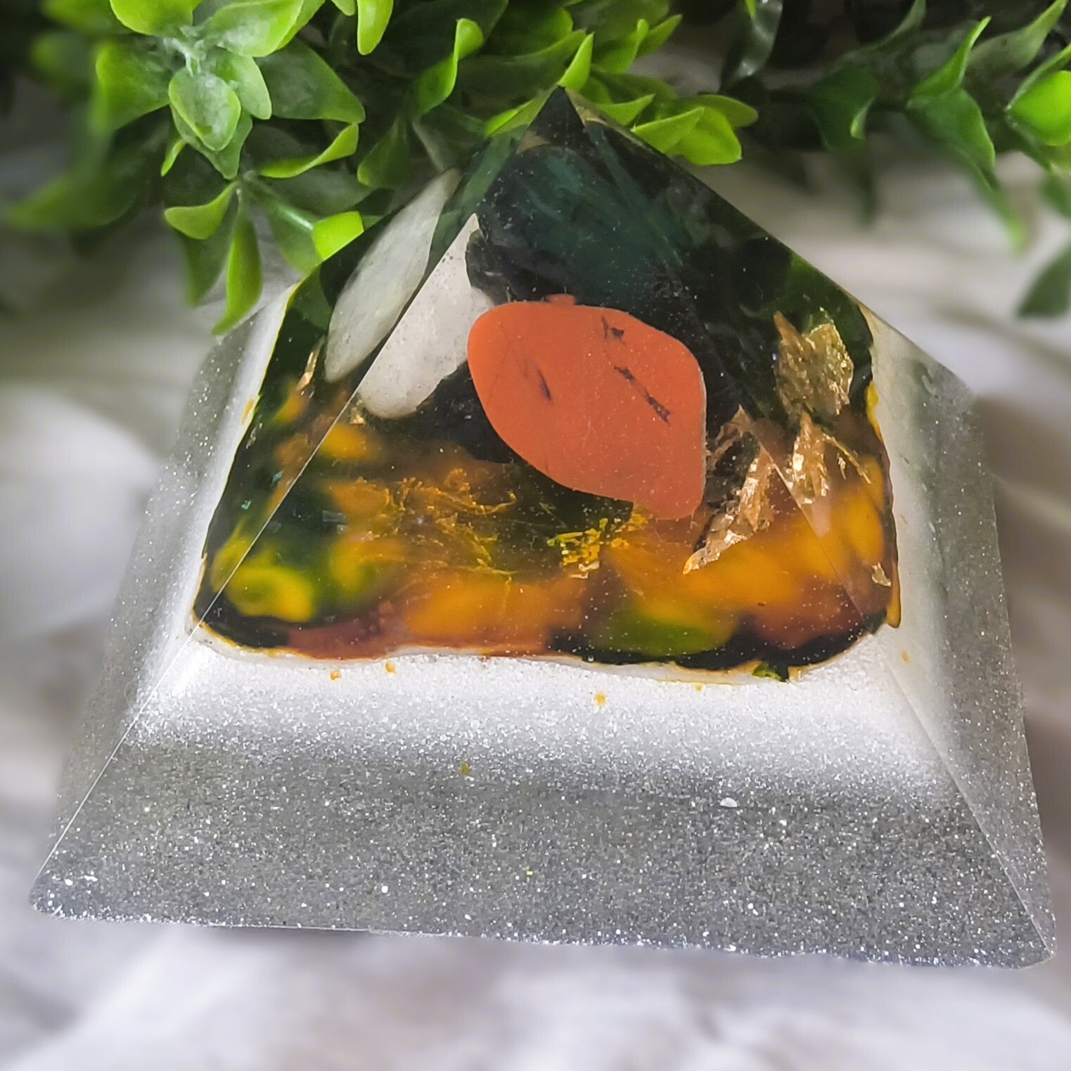 Deze orgonite piramide is leuk om dichtbij u te zetten bijvoorbeeld op het bureau of het nachtkastje. Het heeft een bereik van ongeveer 2 meter rondom de piramide.